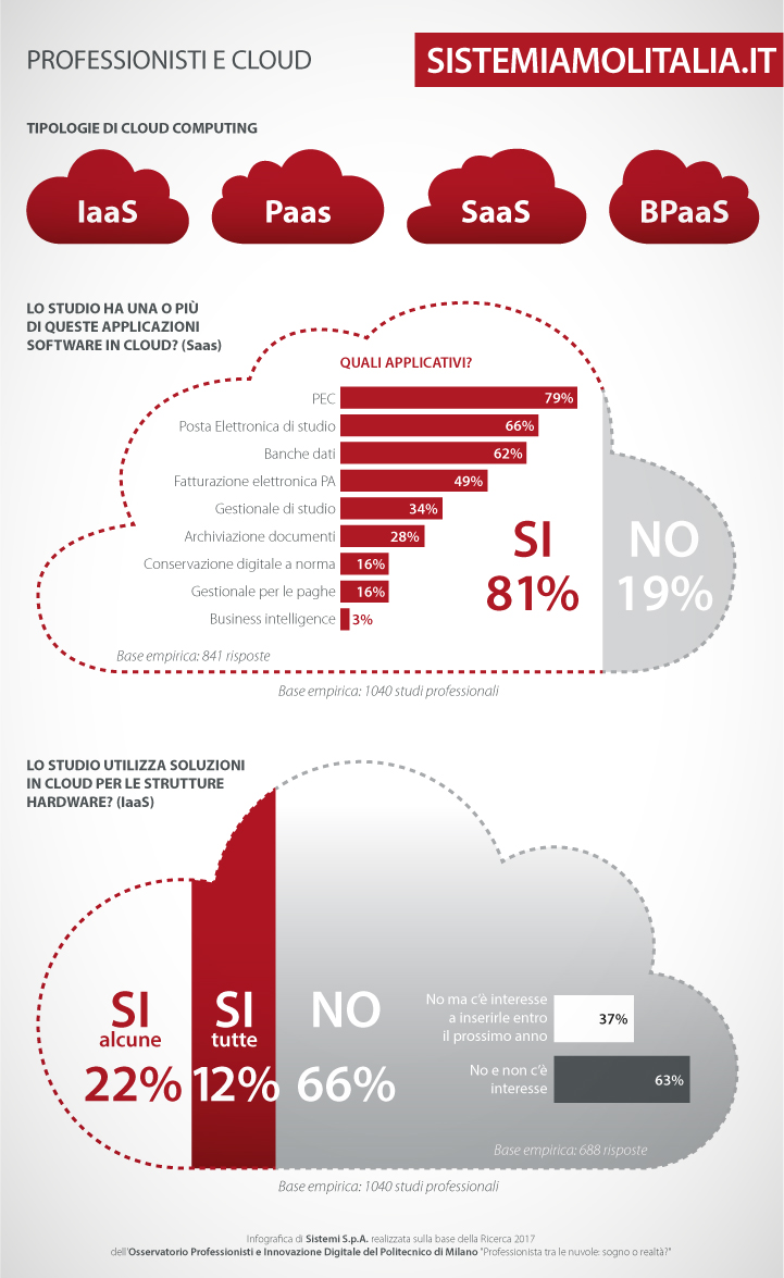 Negli ultimi quattro anni, la spesa italiana per l’acquisto di soluzioni cloud è cresciuta di circa il 17% l’anno. A fronte di questa crescita, è interessante studiare come i professionisti abbiano adottato o stiano adottando delle soluzioni cloud per le proprie attività, e quali vantaggi e ostacoli vedano nell’adozione di queste tecnologie.